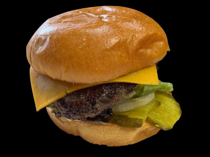 Juicy ¼ lb Black Angus burger with rich, melted cheddar, ketchup, mustard, dill pickles, and fresh onion on a soft, buttery toasted brioche bun. Hot, fresh, and bursting with classic burger goodness.